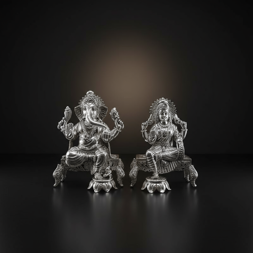 Invite prosperity and wisdom into your home with our beautifully crafted Lakshmi Ganesh Silver Murtis placed on an elegant chowki. This divine pair makes a heartfelt and auspicious gift for loved ones, symbolizing the perfect blessing of wealth, success, and new beginnings.